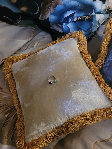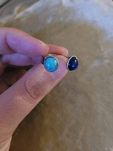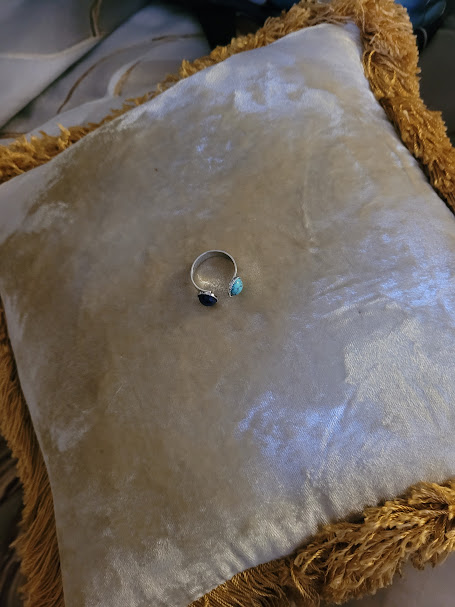 Bague ajustable en acier inoxydable argenté, avec une pierre en lapis-lazuli, et une autre en fausse turquoise.