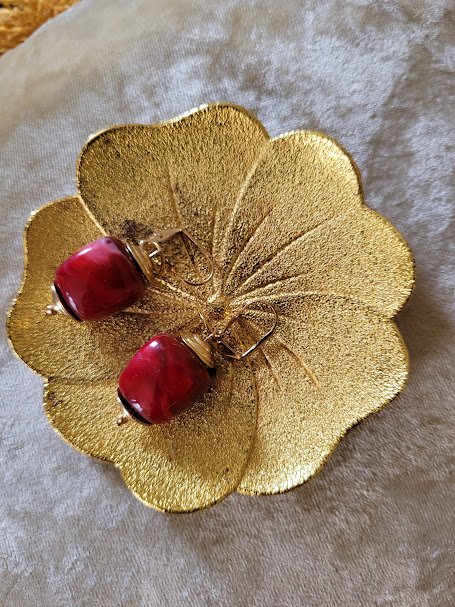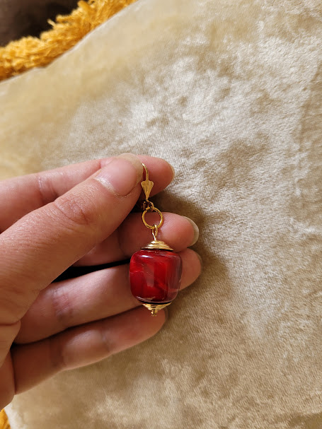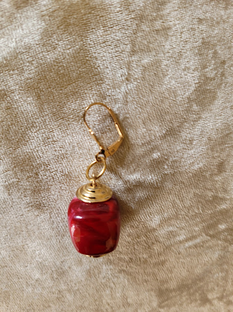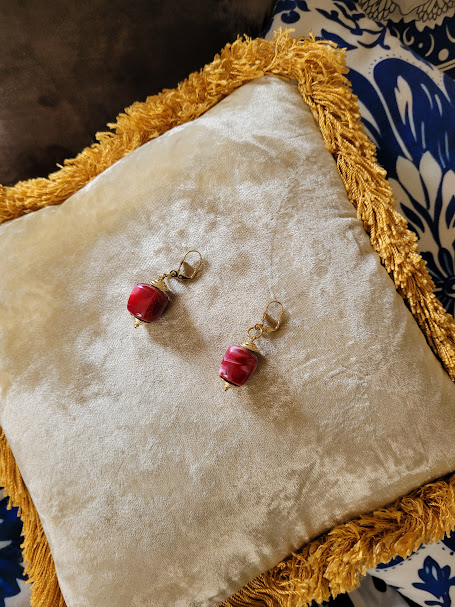 Boucles d’oreilles dormeuses avec des perles en acrylique bordeaux entourées de demi-lunes dorées