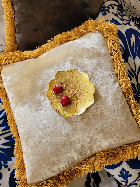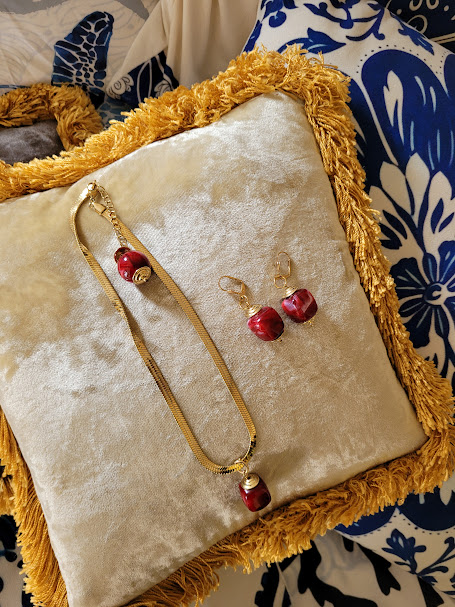 Les boucles contiennent chacune une perle en acrylique bordeaux, entourée de demi-lunes à rangs dorées.