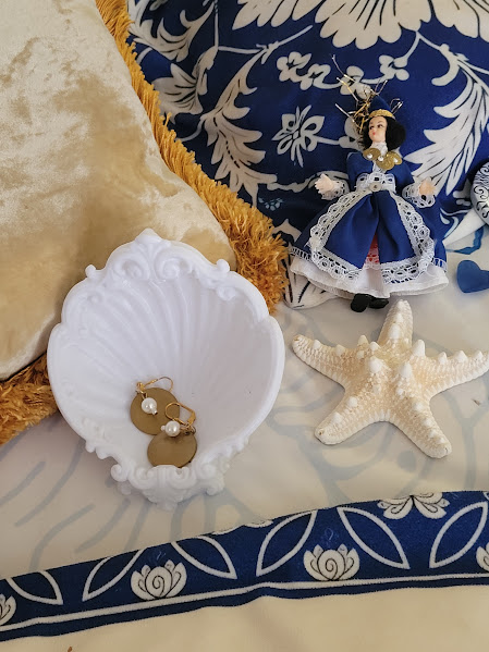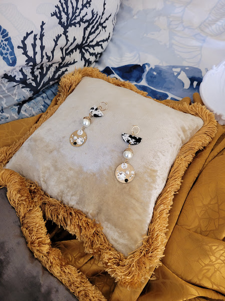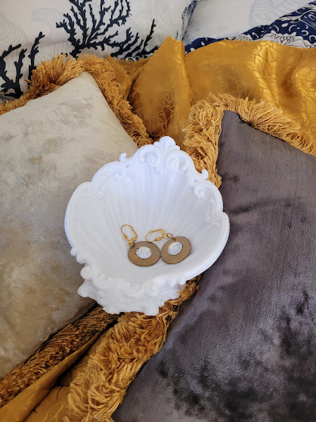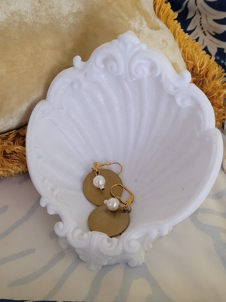 Boucles d’oreilles avec attaches dorées de dormeuses, et dessus un petit coquillage allongé discret.