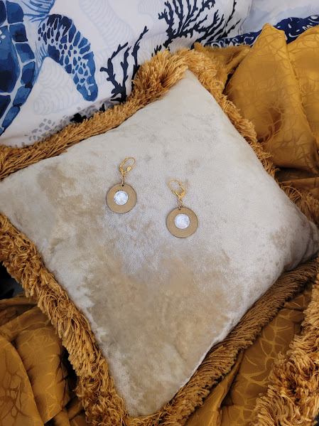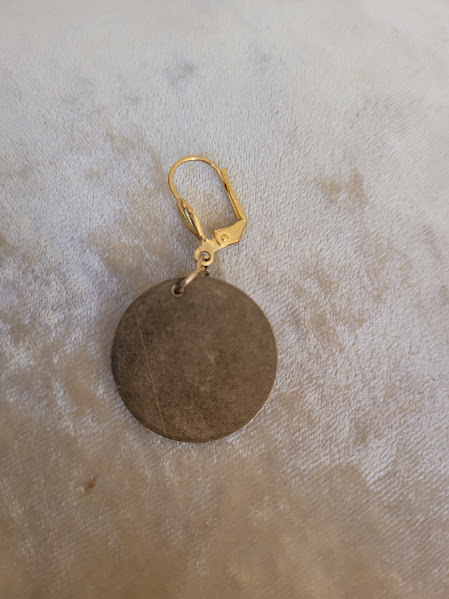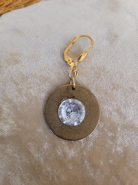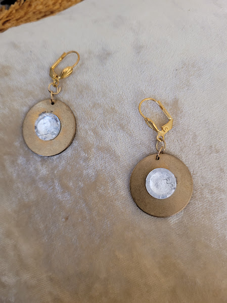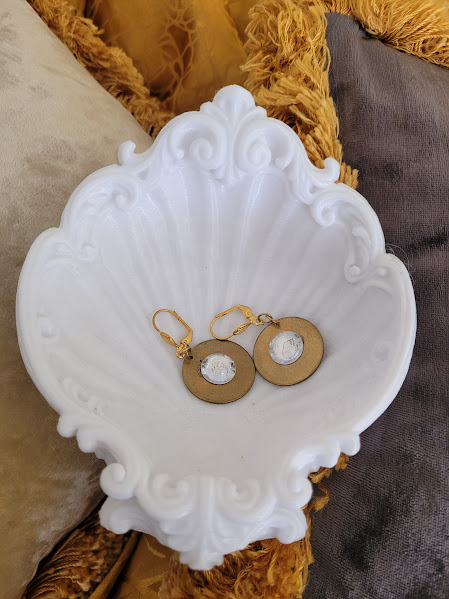 Les boucles portent chacune un disque cuivré vintage, où sont collés deux strass de taille moyenne transparents.