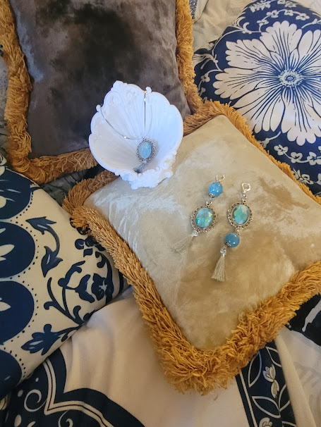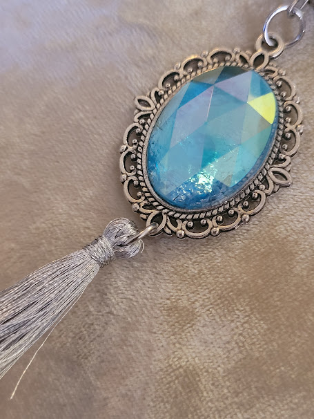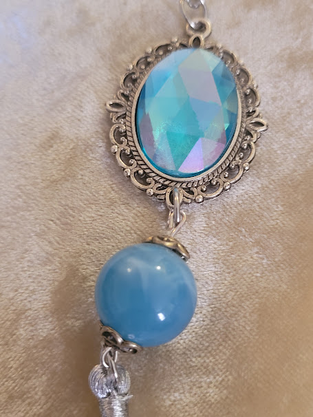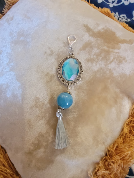 Les deux boucles sont différentes, et possèdent chacune dans un ordre différent un cadre argenté avec un gros strass irisé bleu ciel, une perle ronde en acrylique ornée de fleurs bronze, et un pompon argenté.