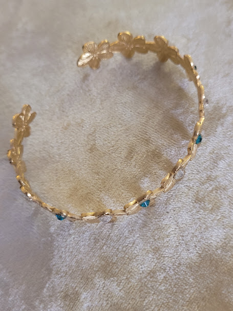 Bracelet avec des fleurs en acier inoxydable doré, et strass Swarowski bleus ciel et transparents alternés