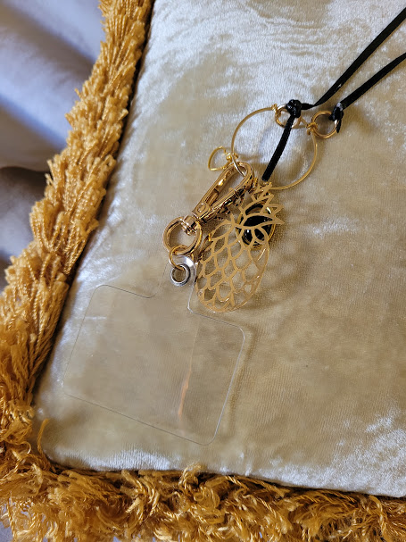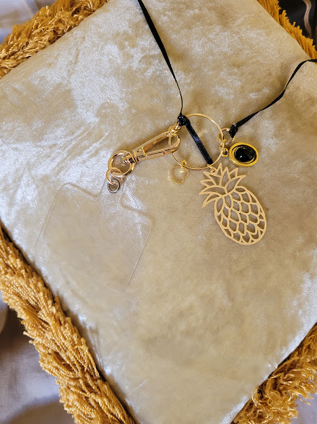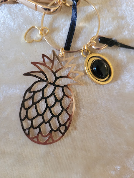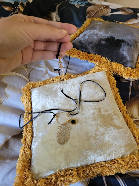 Les liens se terminent autour d’un grand anneau doré, auquel pendent plusieurs pendentifs : un ananas, un ovale avec une agate noire, et un petit cœur mobile.