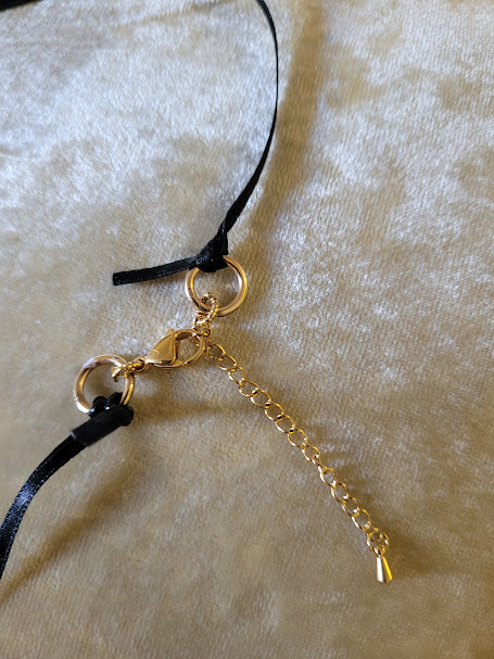 Collier fait avec des liens en ruban noir satiné et un fermoir doré avec une petite chaîne ajustable.