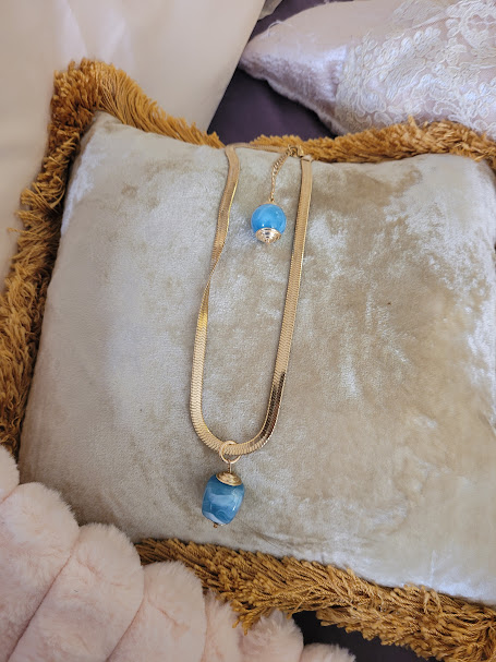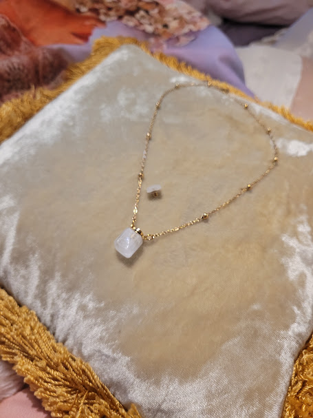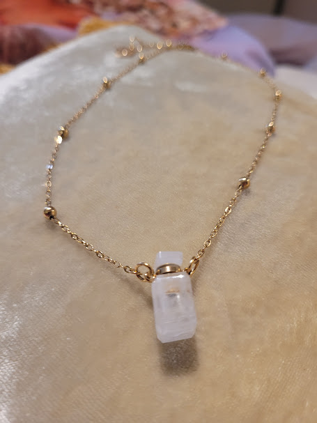 Il possède un pendentif avec un flacon de parfum en cristal de roche.