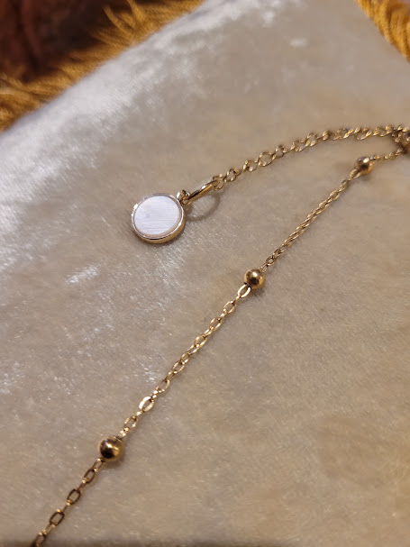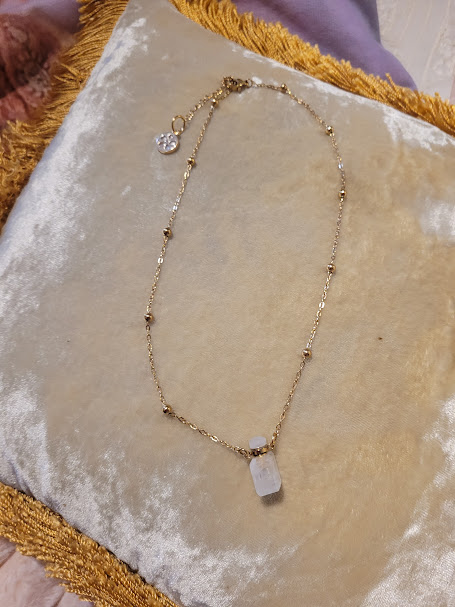 Collier fait avec une chaîne en acier doré inoxydable fine ornée de petites perles dorées de manière régulière.