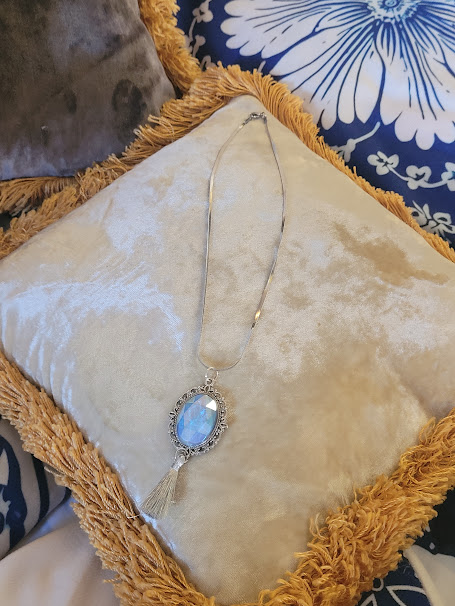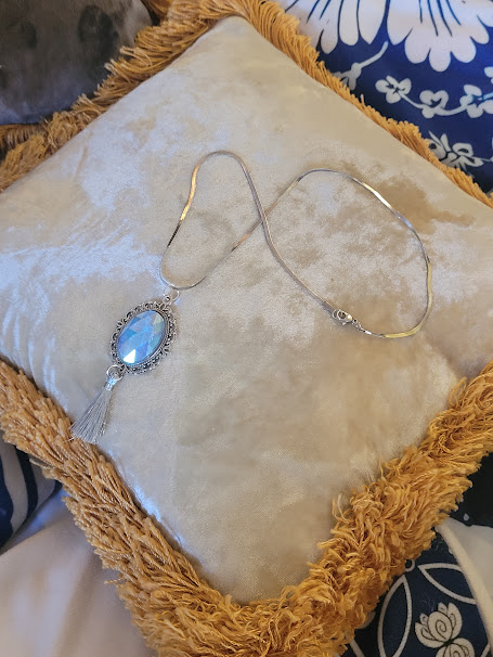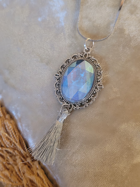 Il possède un pendentif avec un cadre argenté qui entoure un strass bleu ciel irisé, au-dessus d’un pompon aux fils argentés.