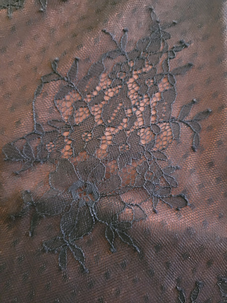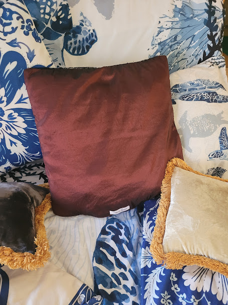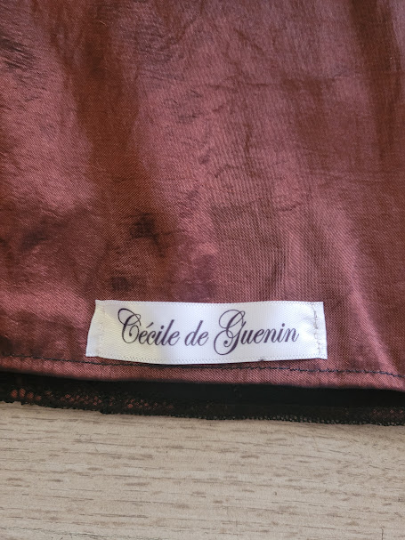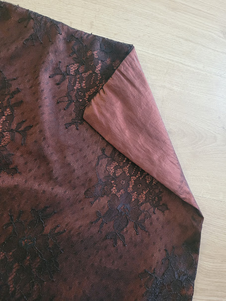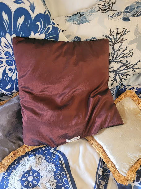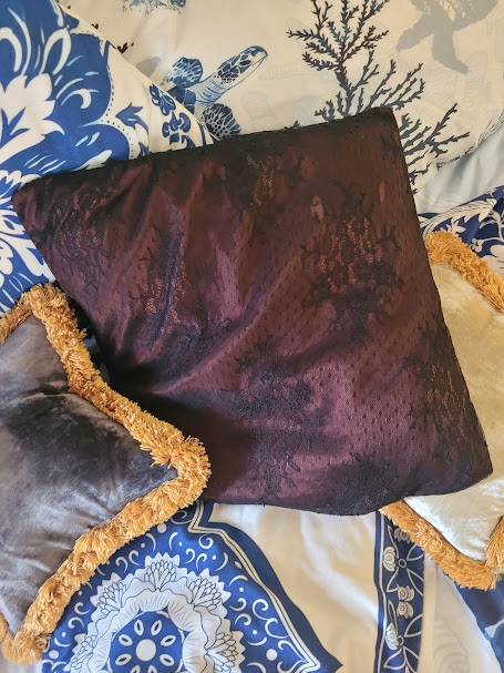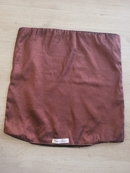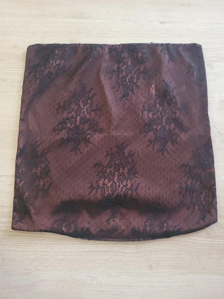 Housse de coussin fait avec du tissu satiné et irisé de couleur marron, recouvert de dentelle noire.